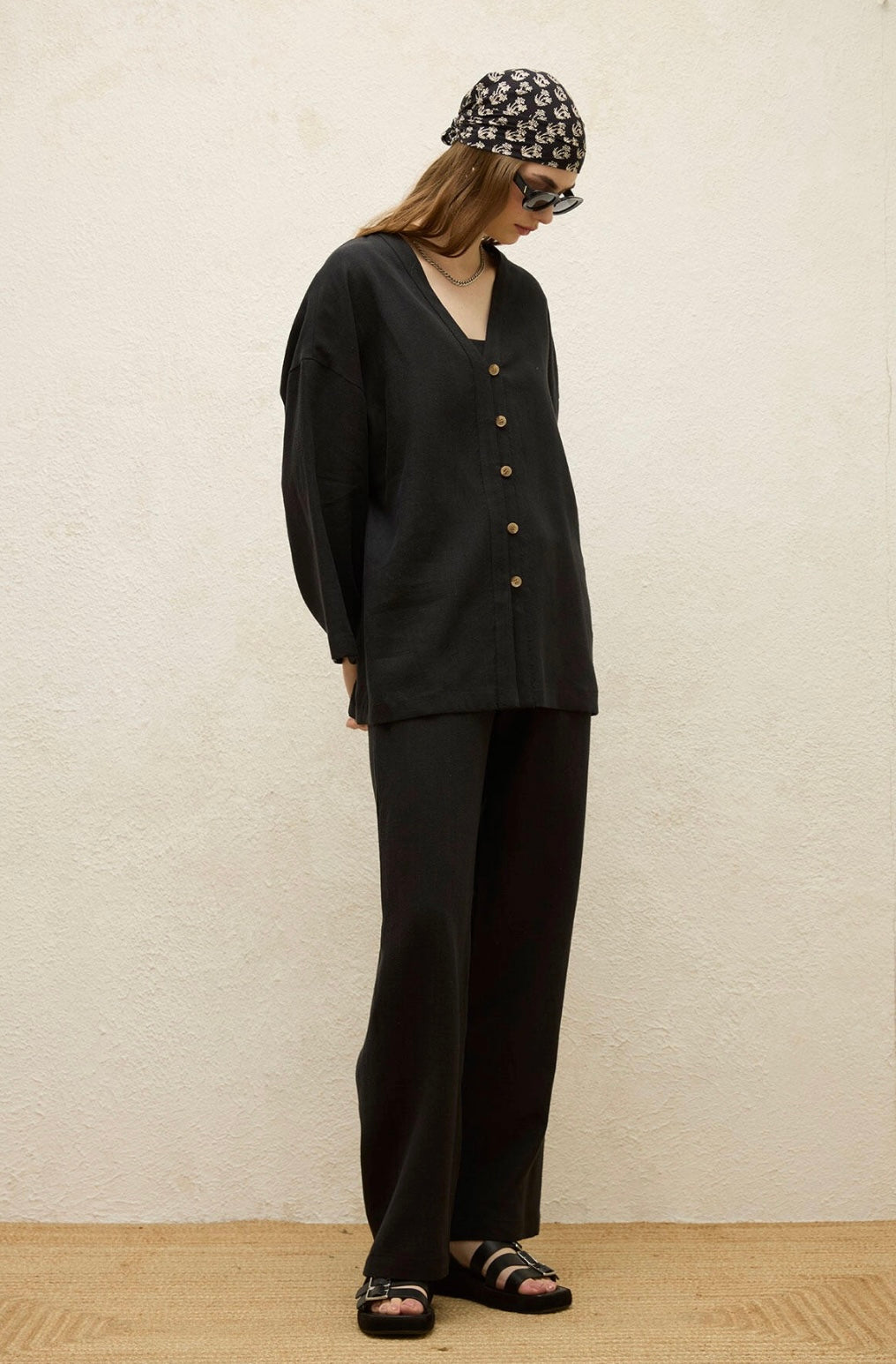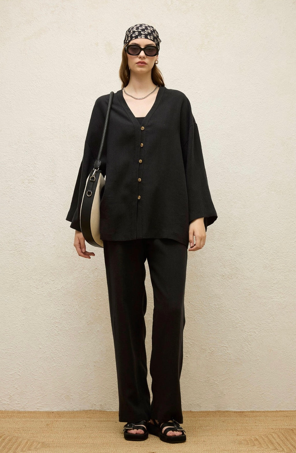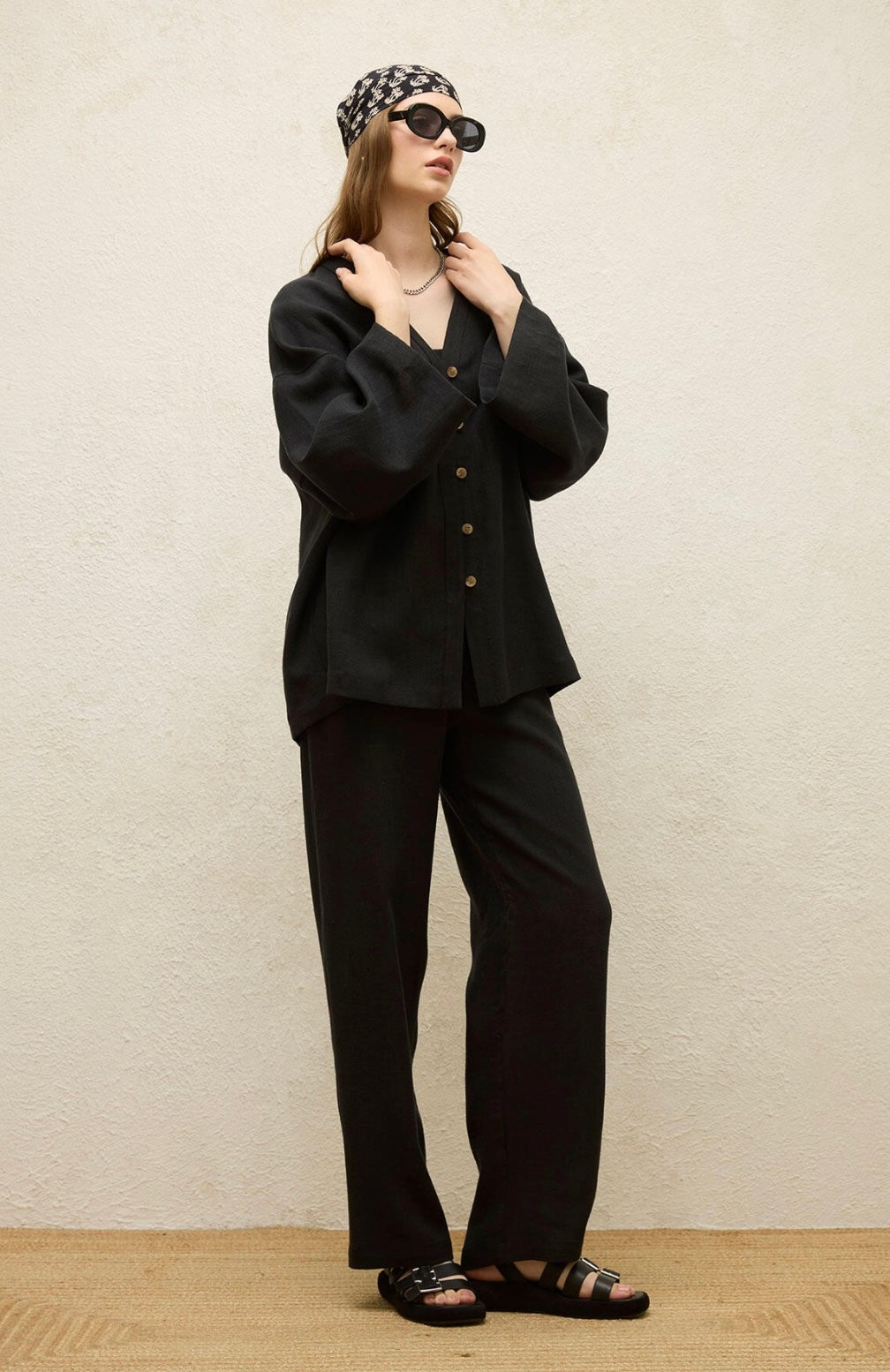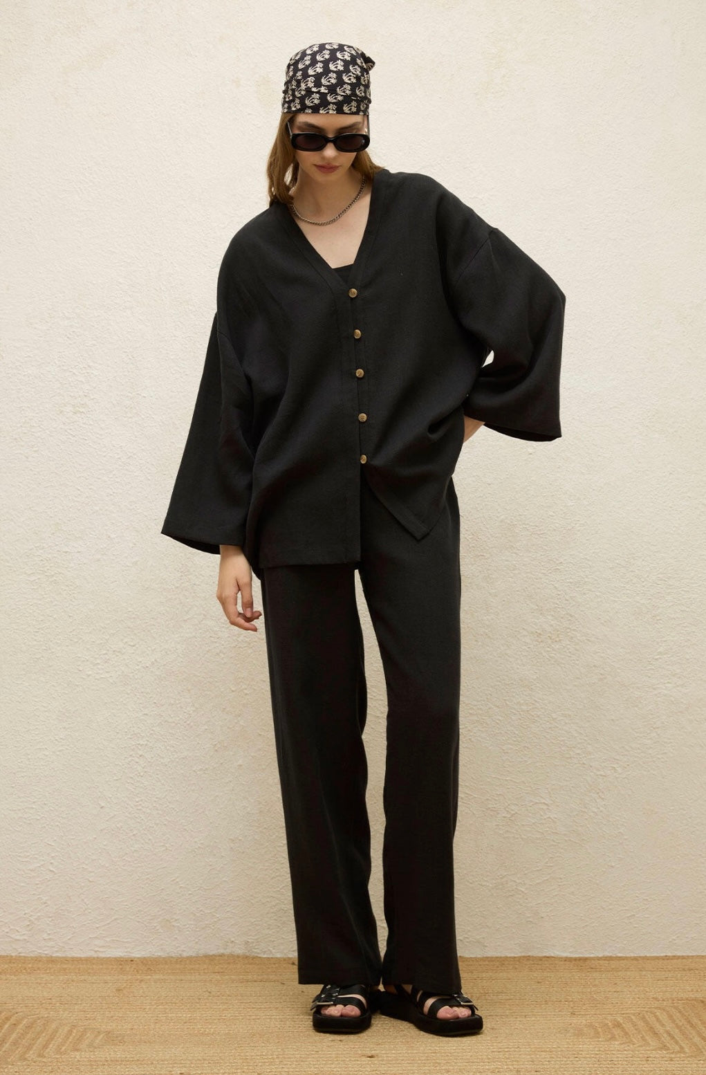 Das Set besteht aus einer weit geschnittenen Tunik mit überschnittenen Schultern, durchgehender Knopfleiste und weiten Ärmeln sowie einer Hose mit hoher Taille, elastischem Bund hinten, gebügelter Bügelfalte, weitem Bein und knöchellangem Schnitt.