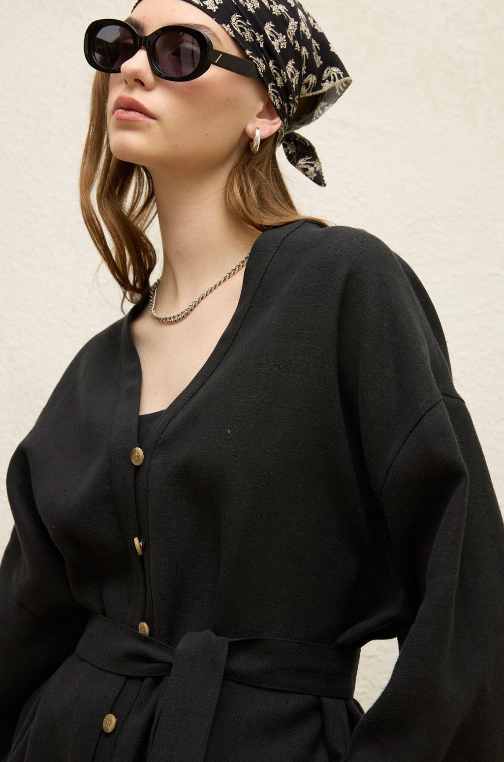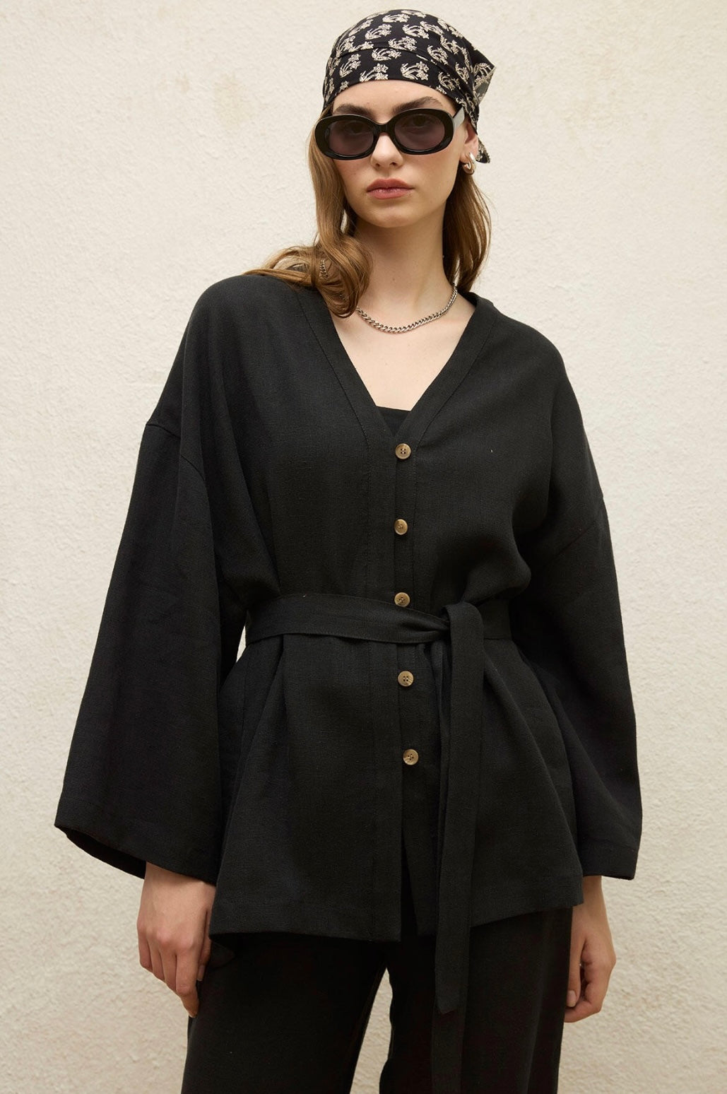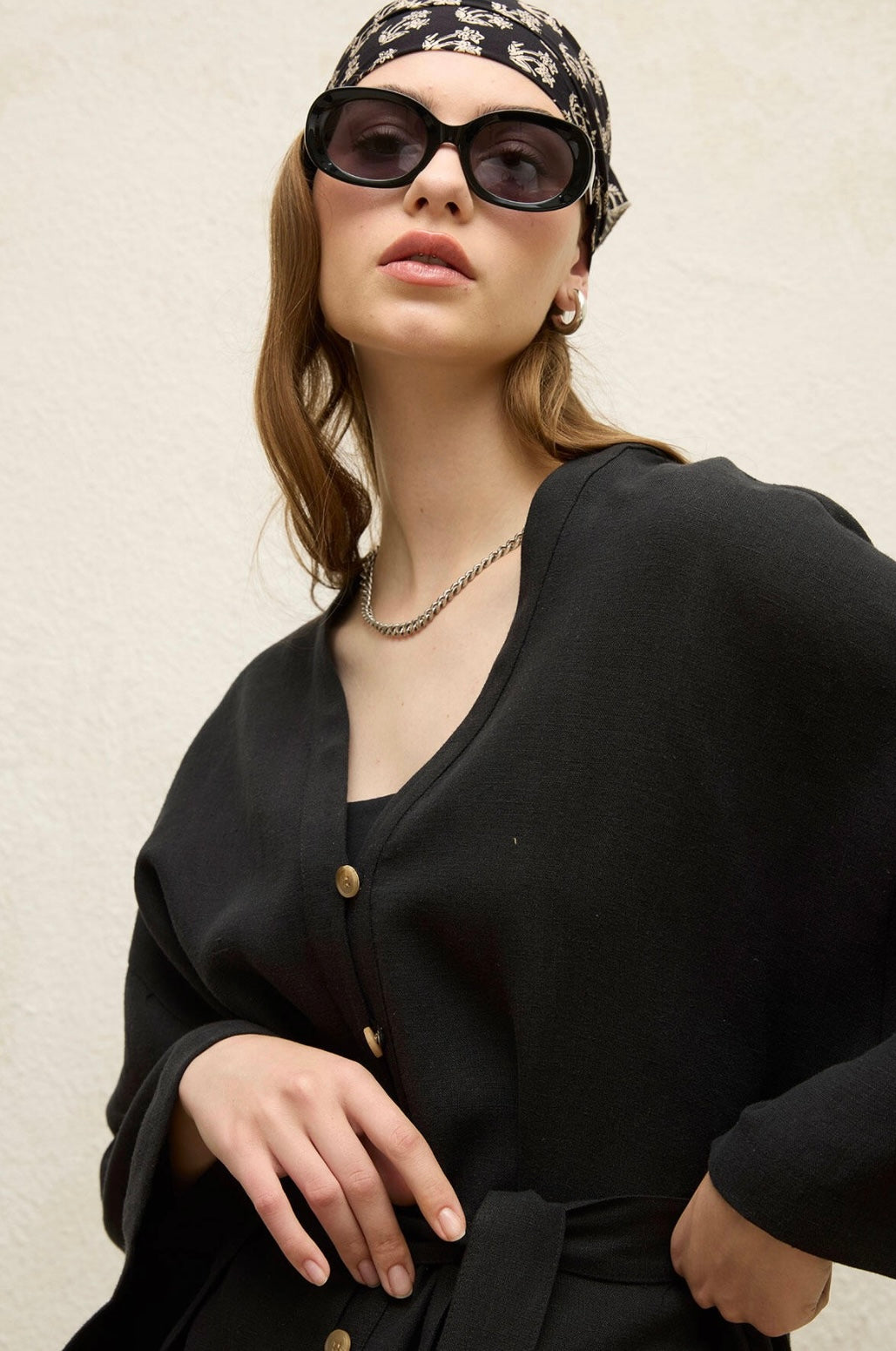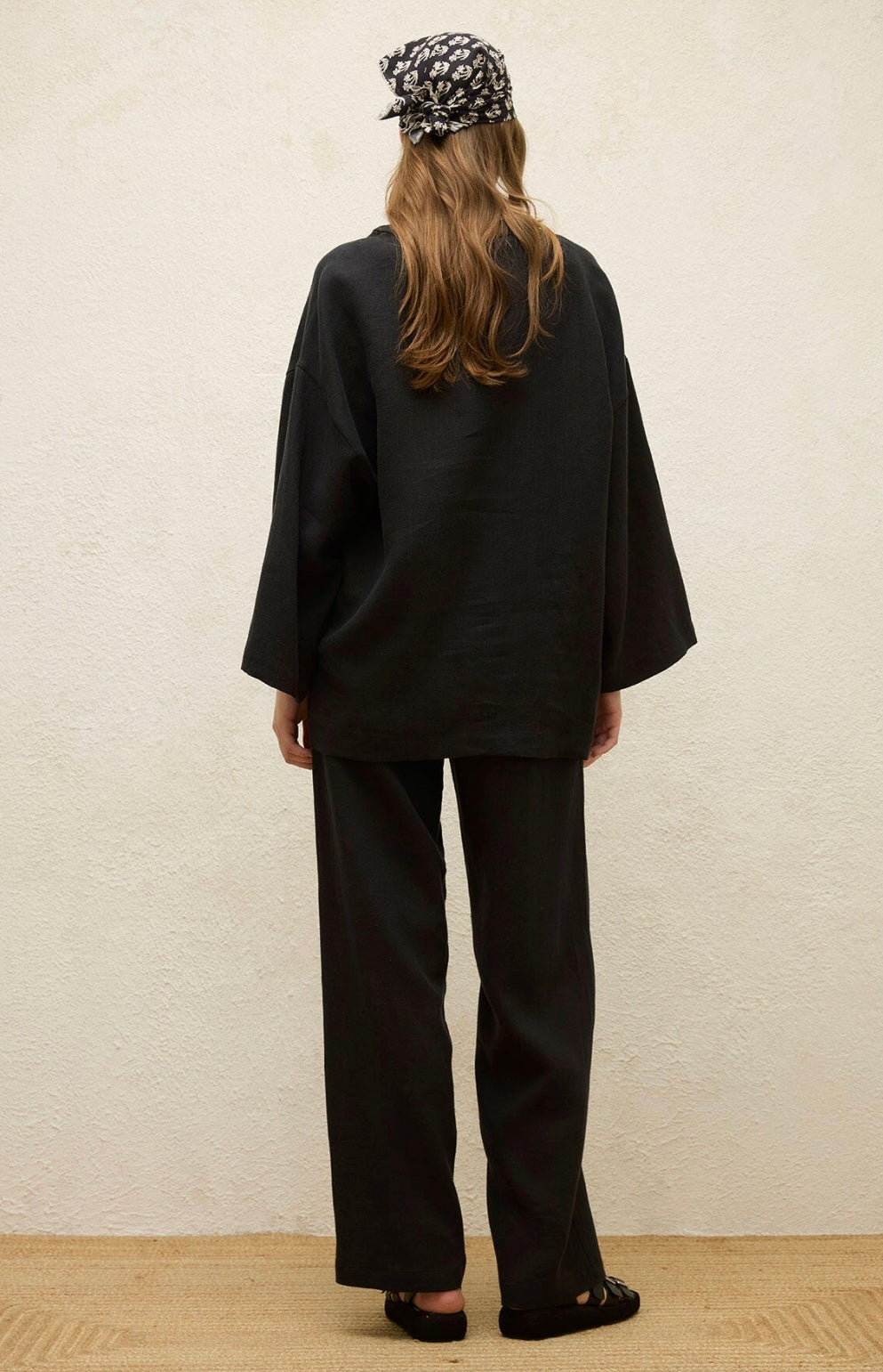 Das Set besteht aus einer weit geschnittenen Tunik mit überschnittenen Schultern, durchgehender Knopfleiste und weiten Ärmeln sowie einer Hose mit hoher Taille, elastischem Bund hinten, gebügelter Bügelfalte, weitem Bein und knöchellangem Schnitt.