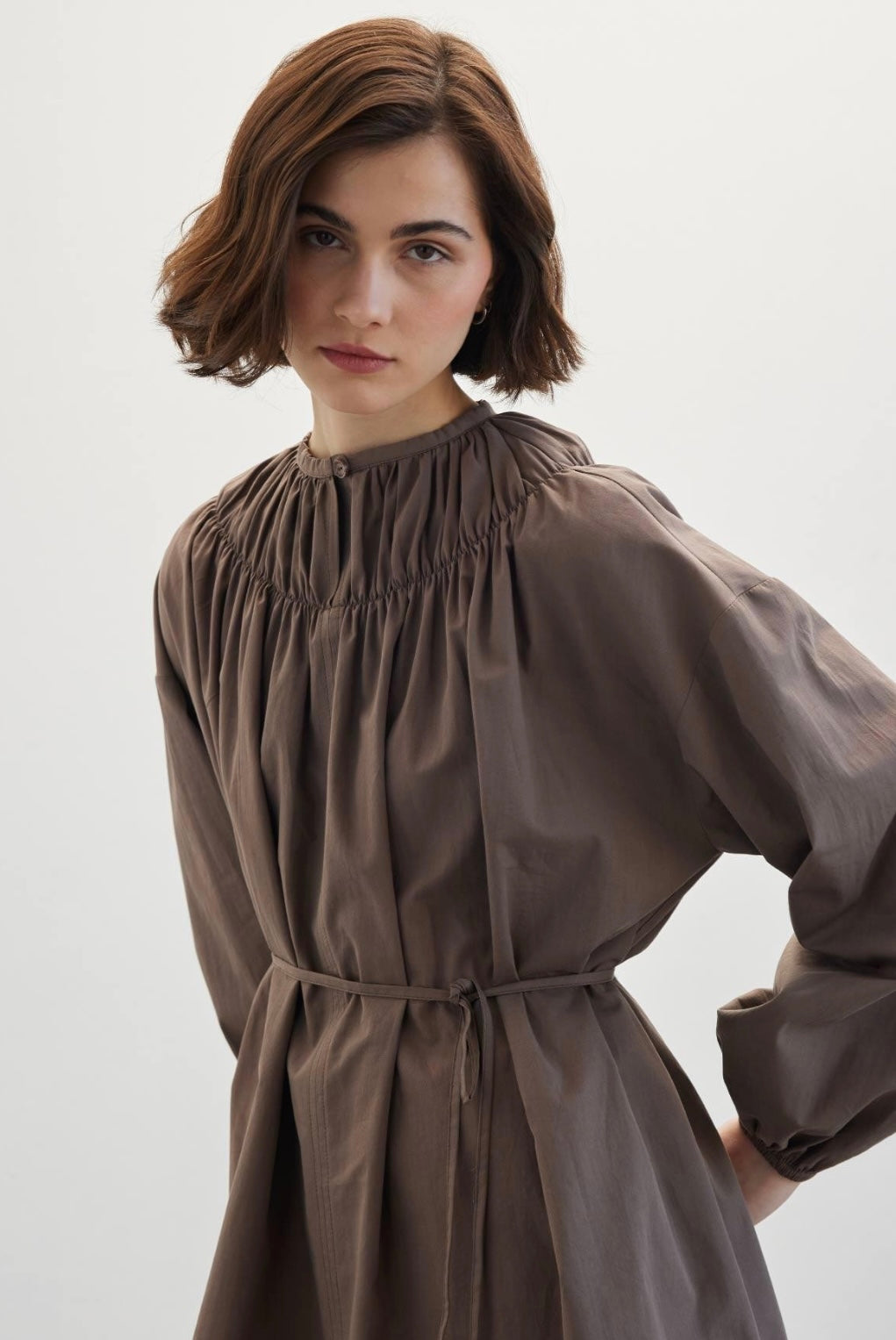 Vorderseitiger Tropfenverschluss, elastischer Kragen mit Raffungsdetail, mit Gürtel, runder Ausschnitt.