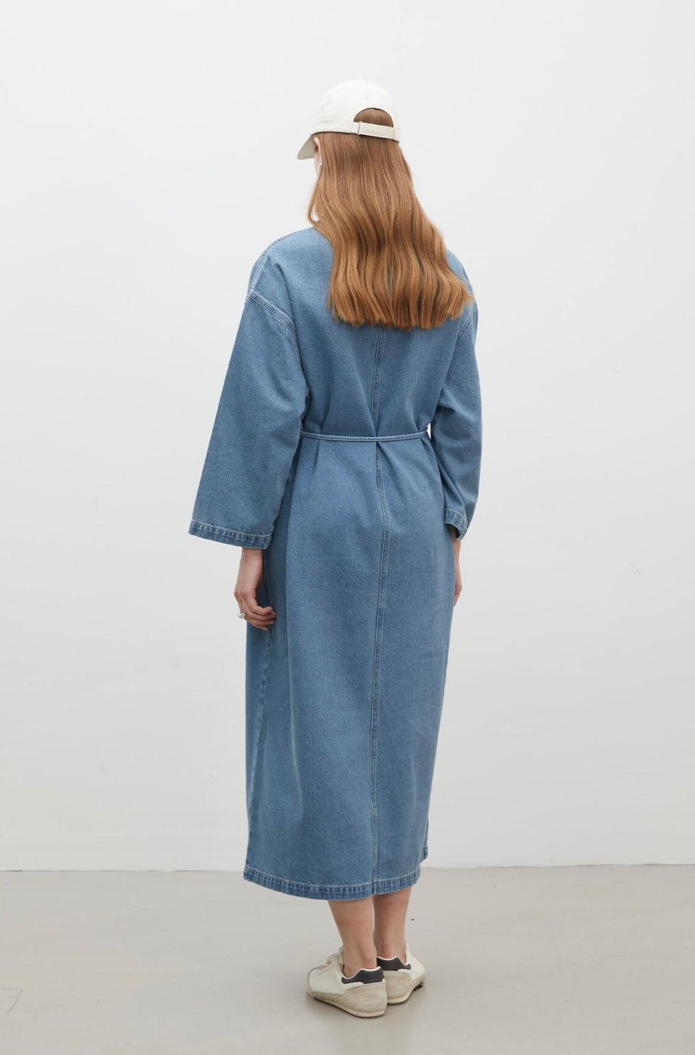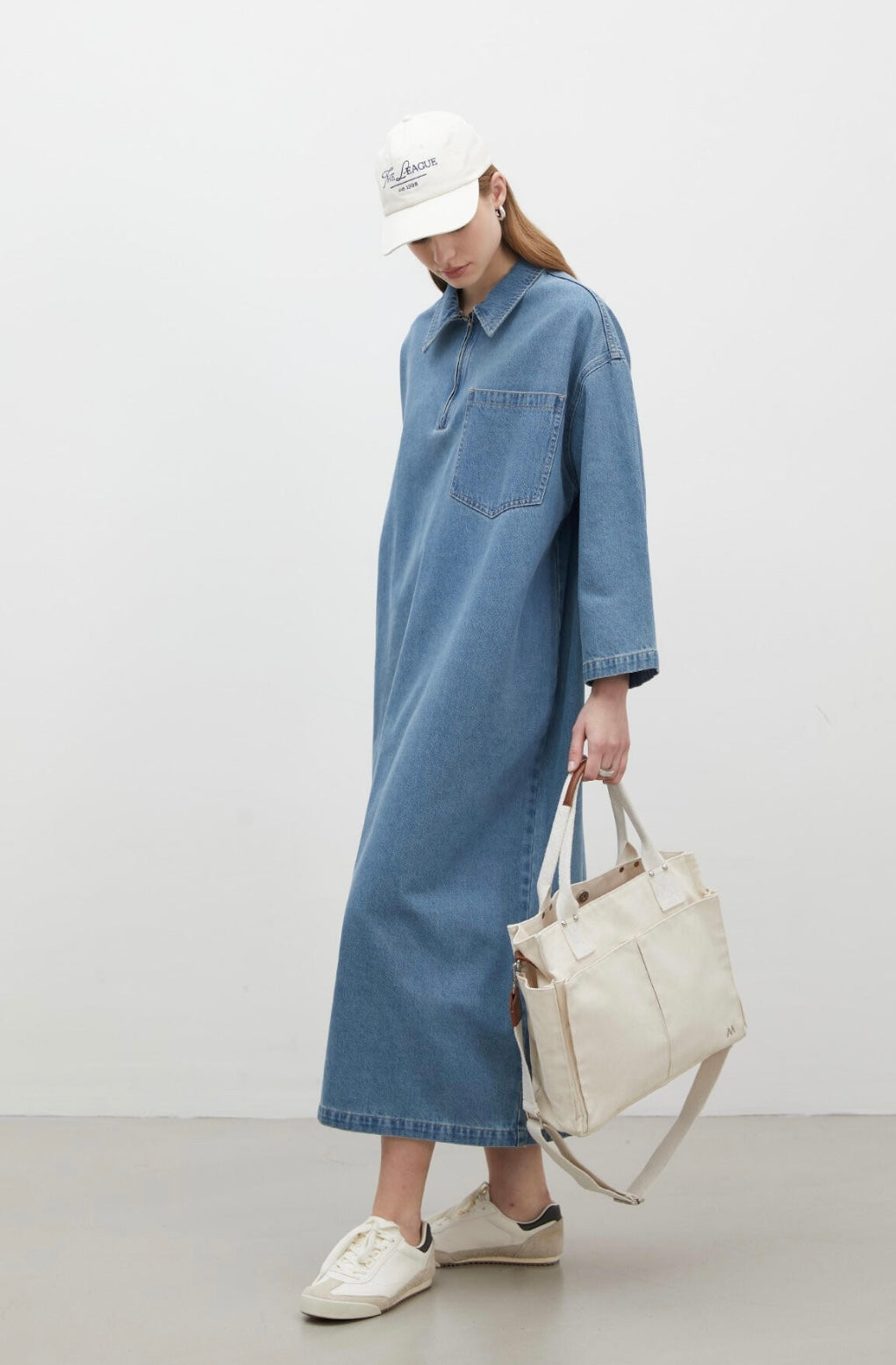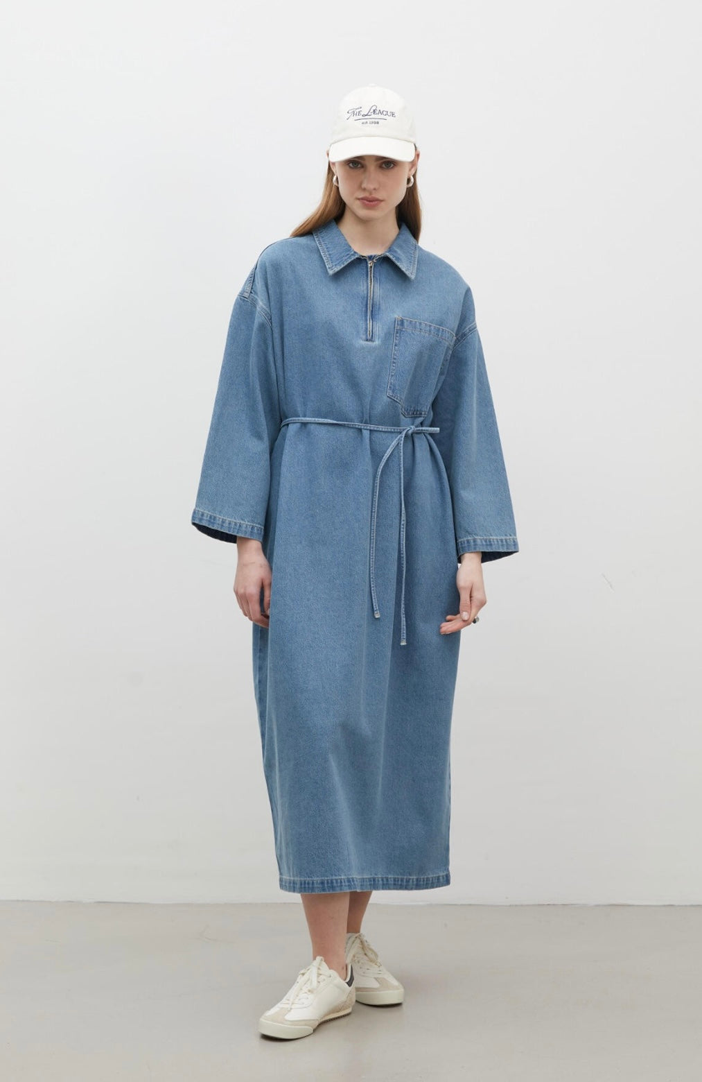 Lässiges Denim-Kleid im Utility-Stil mit Hemdkragen, Reißverschluss und Taillengürtel – perfekt für einen coolen Alltagslook.