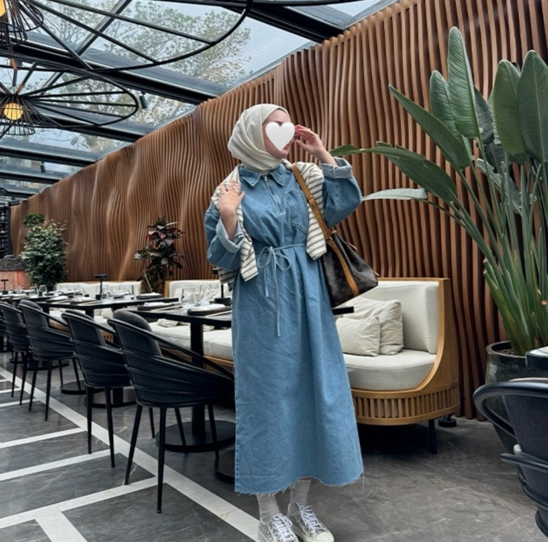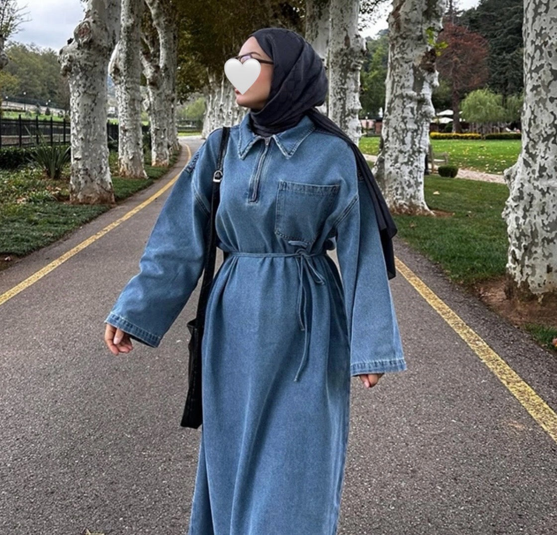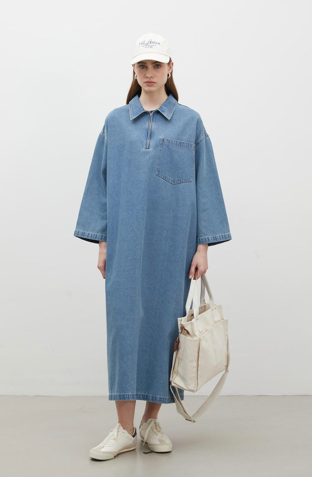 Lässiges Denim-Kleid im Utility-Stil mit Hemdkragen, Reißverschluss und Taillengürtel – perfekt für einen coolen Alltagslook.