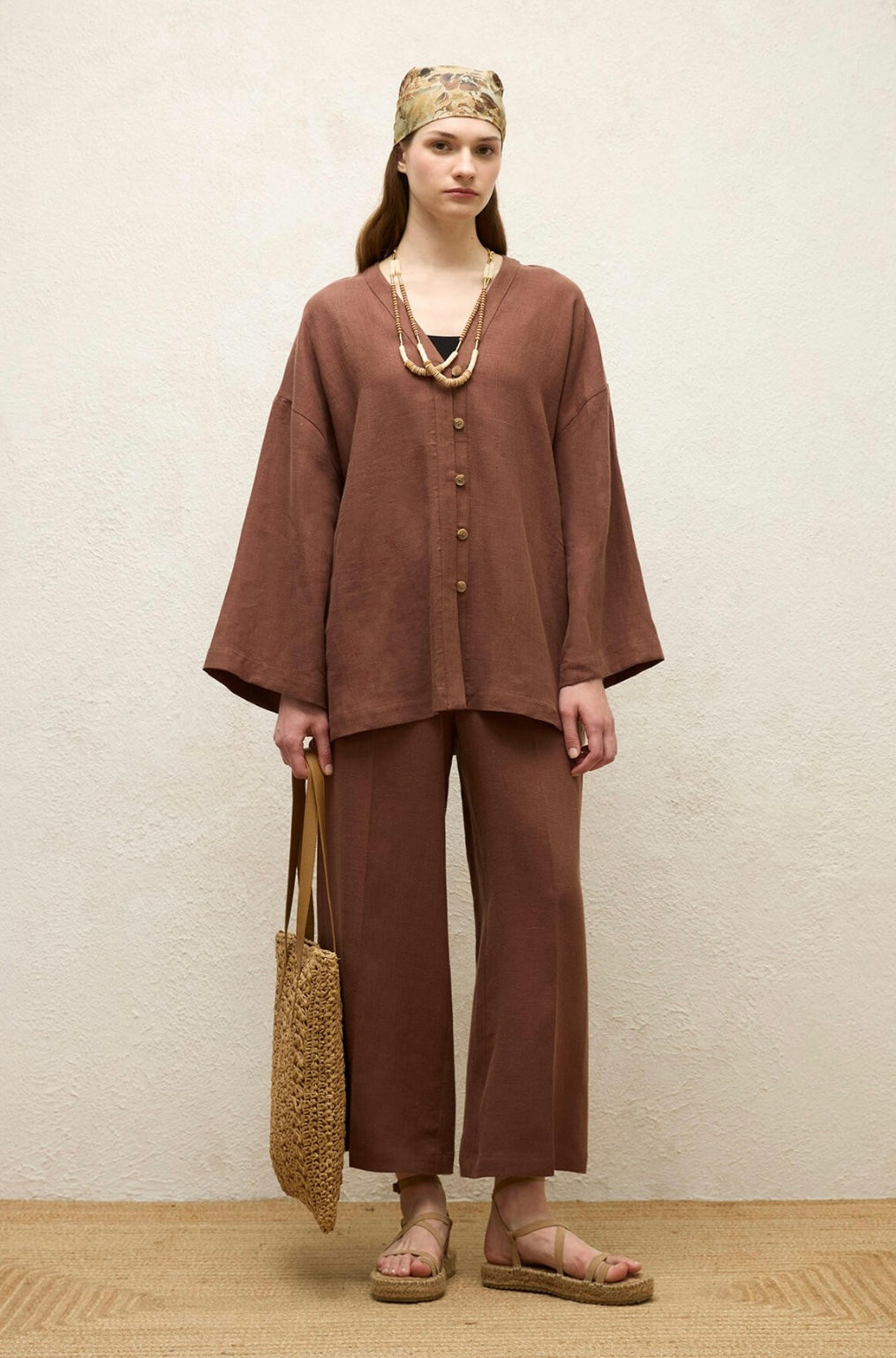 Das Set besteht aus einer weit geschnittenen Tunik mit überschnittenen Schultern, durchgehender Knopfleiste und weiten Ärmeln sowie einer Hose mit hoher Taille, elastischem Bund hinten, gebügelter Bügelfalte, weitem Bein und knöchellangem Schnitt.