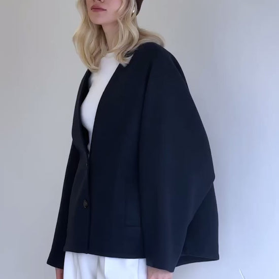 Schlitzärmel, mit Knopfleiste, gefüttert, Seitentaschen, aus Wollstoff.