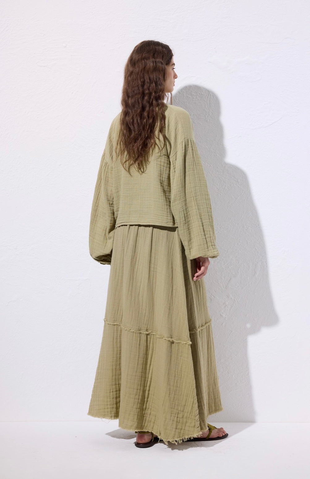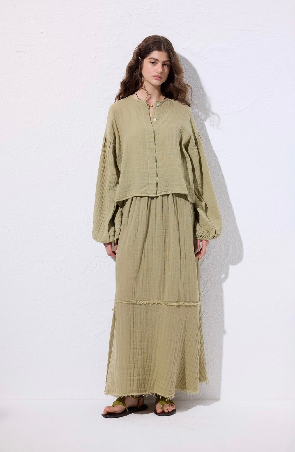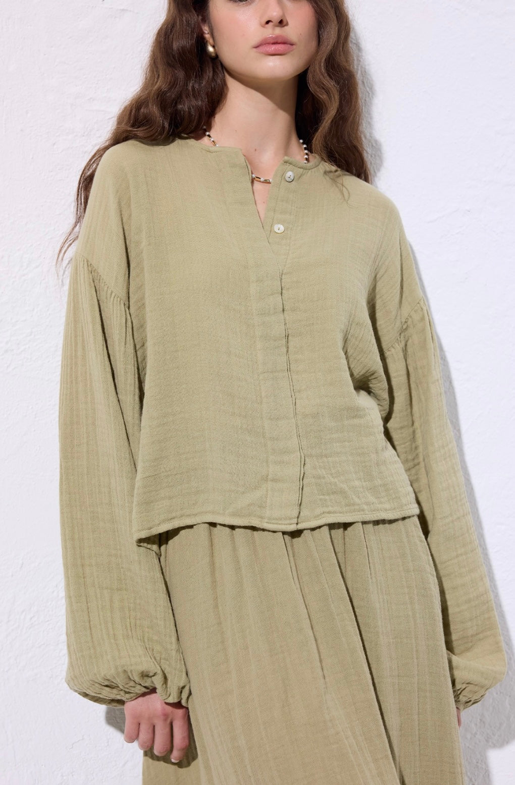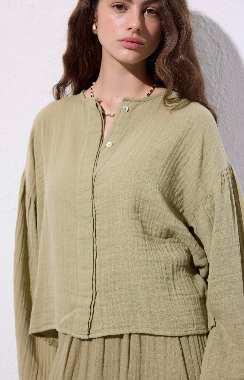 Musselin-Oberteil mit rundem Ausschnitt, langen Ärmeln und Knopfverschluss. Der kurze Schnitt macht es zum perfekten Match für den Musselin-Rock.