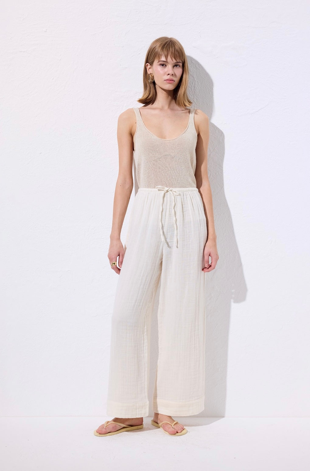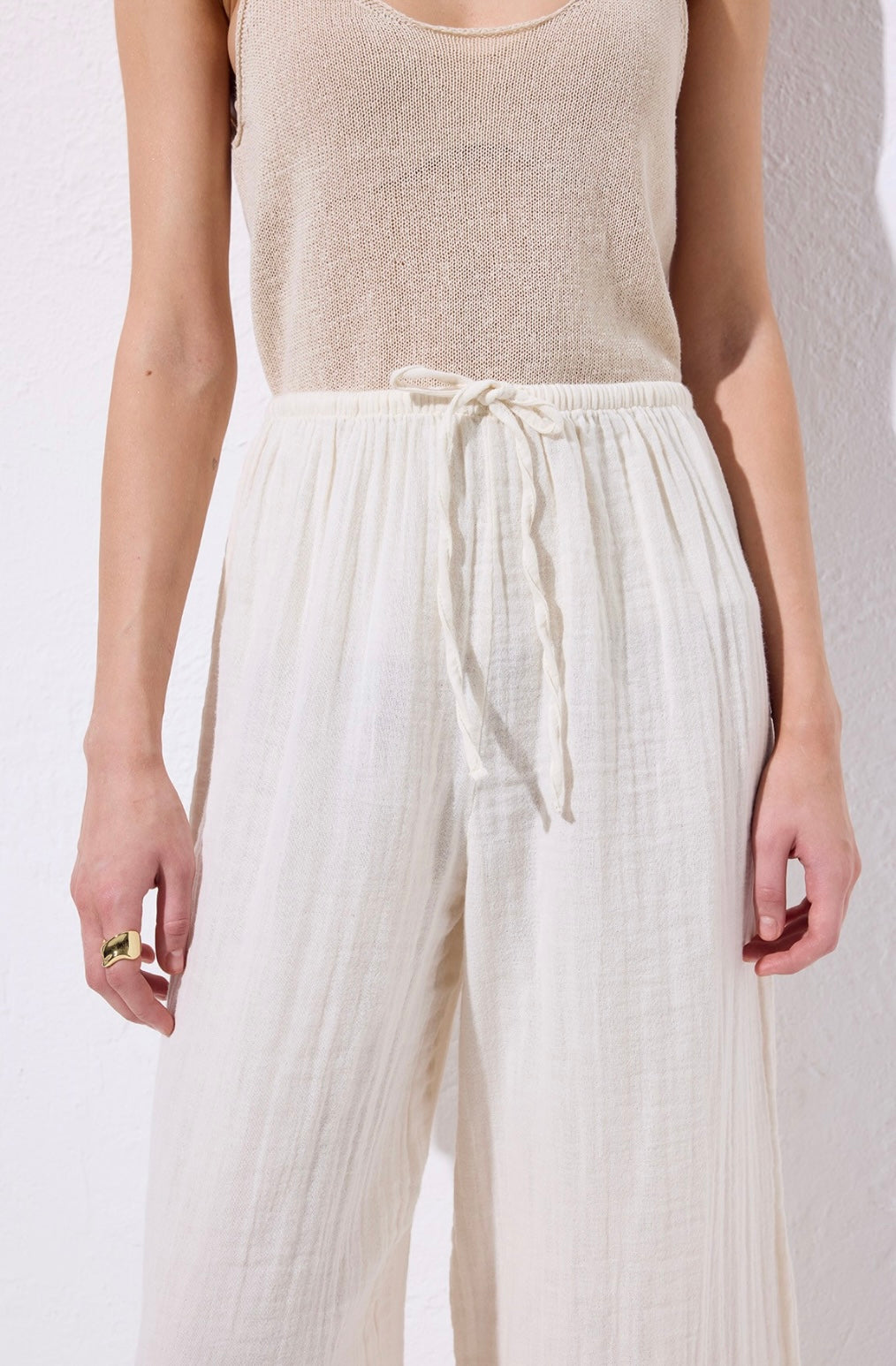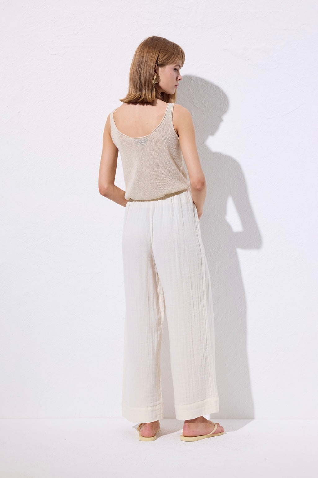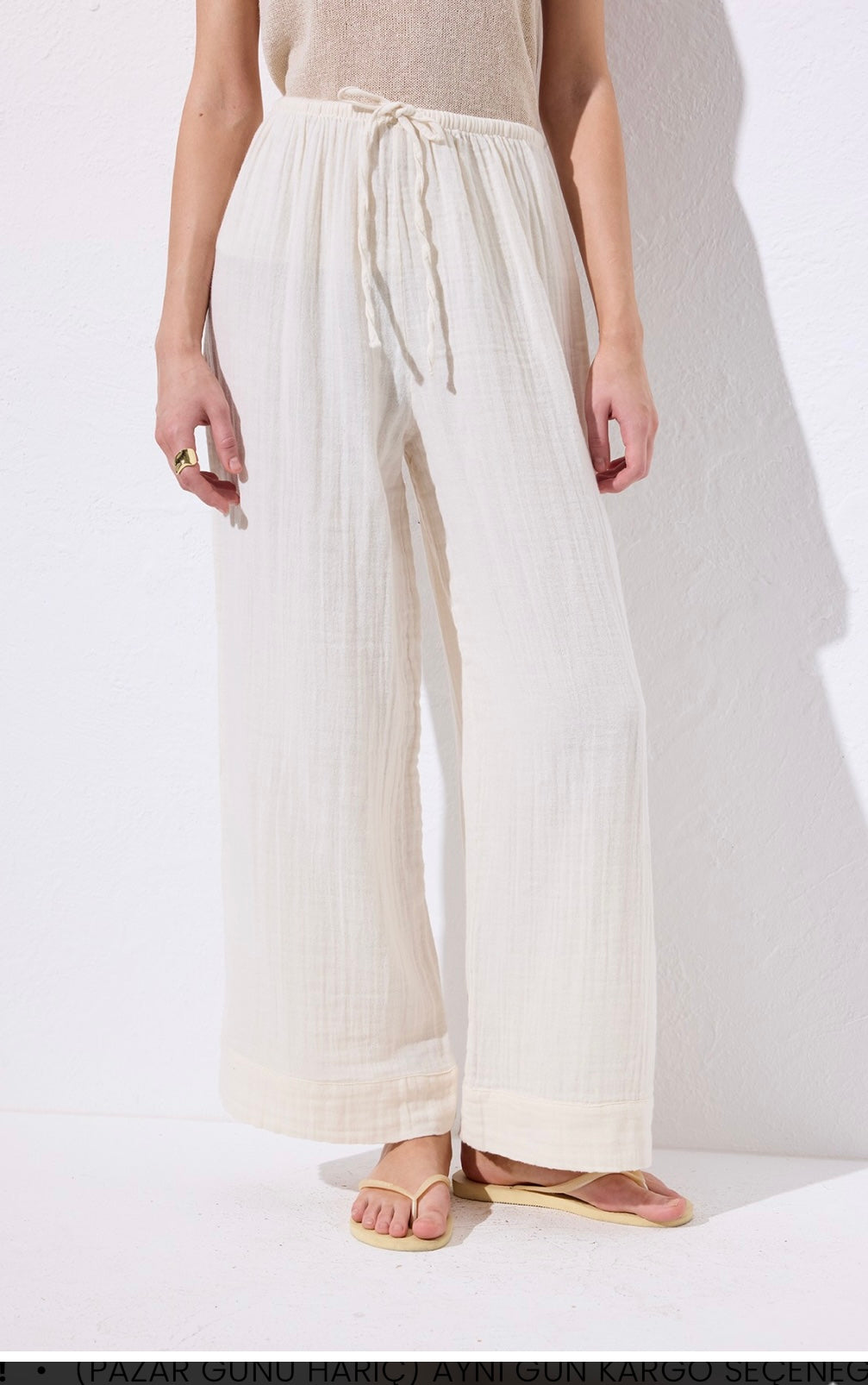 Normale Passform, hohe Taille, knöchellang, elastischer Bund mit Bindegürtel. Aus gewebtem Stoff gefertigt.