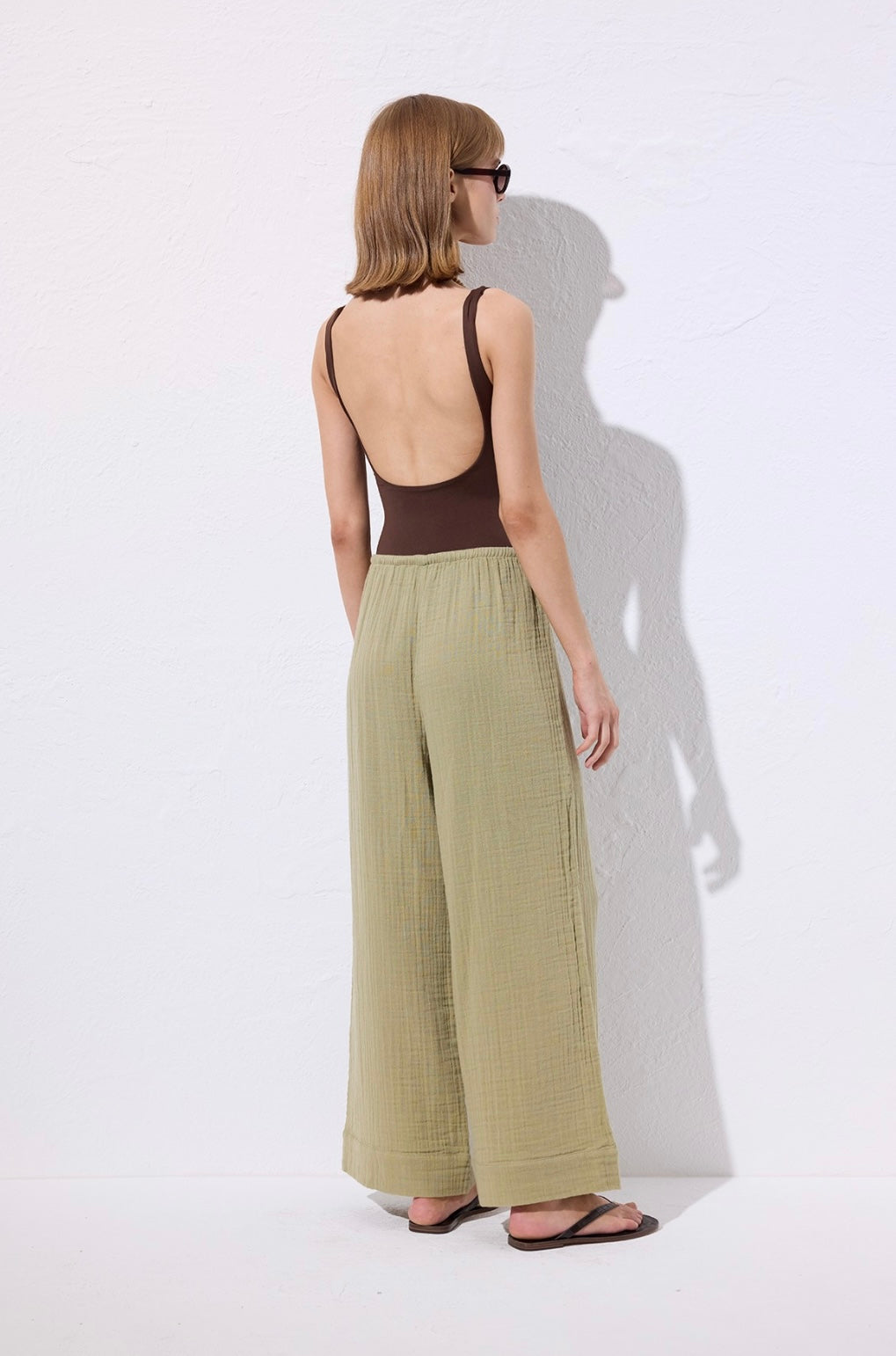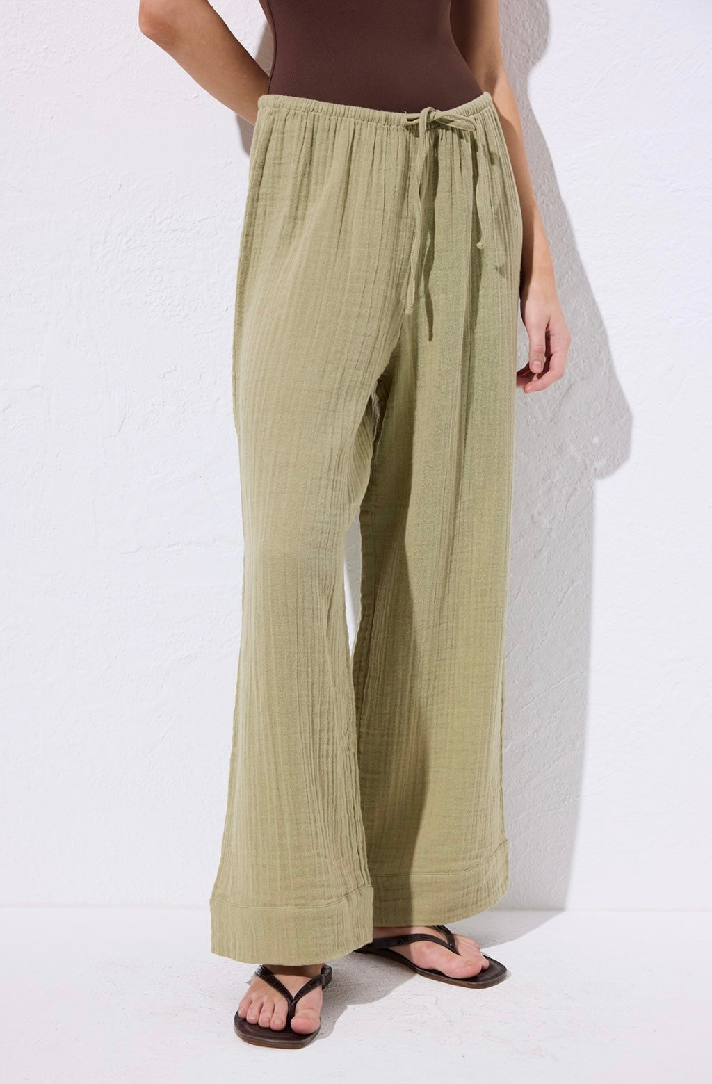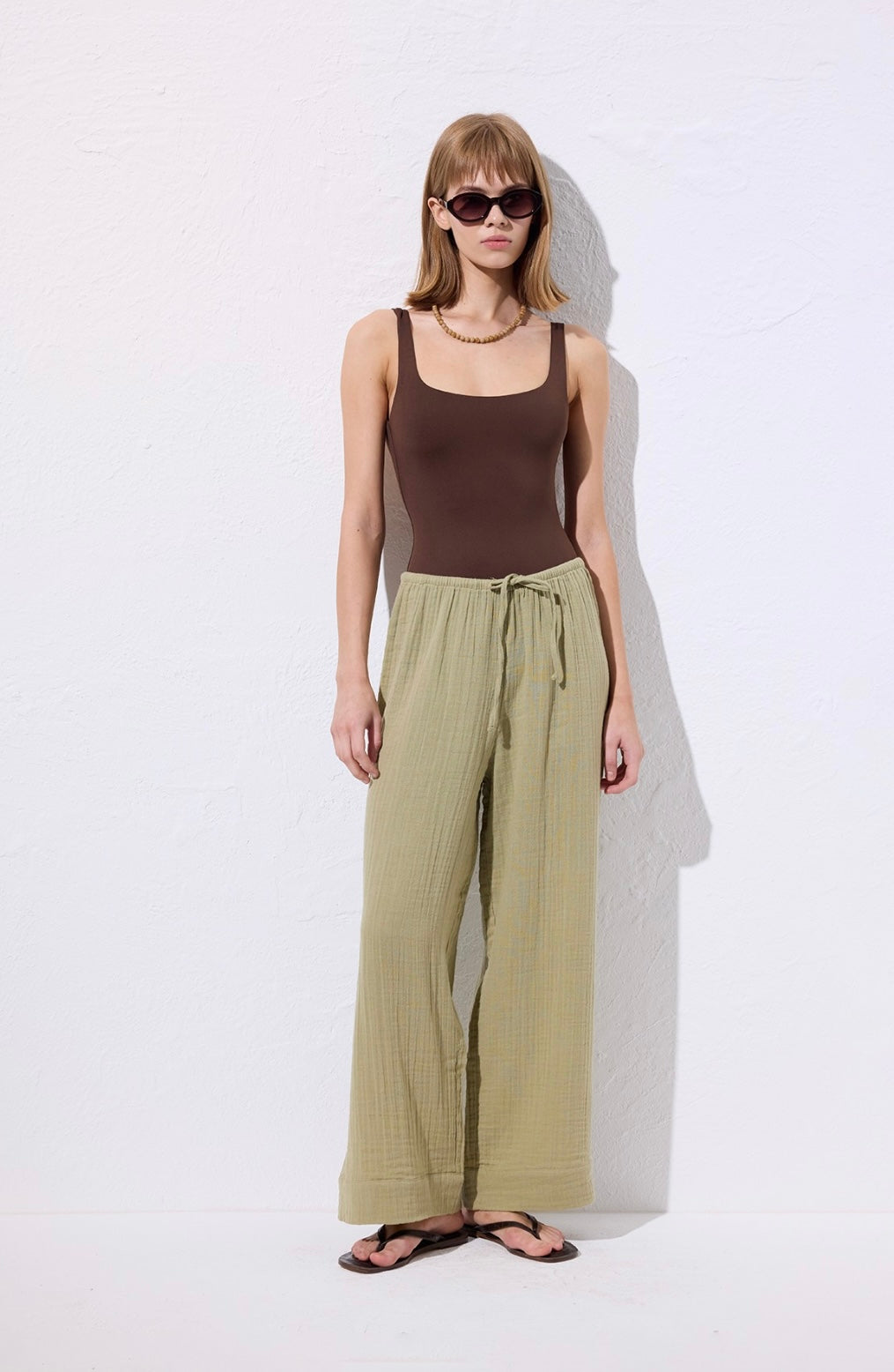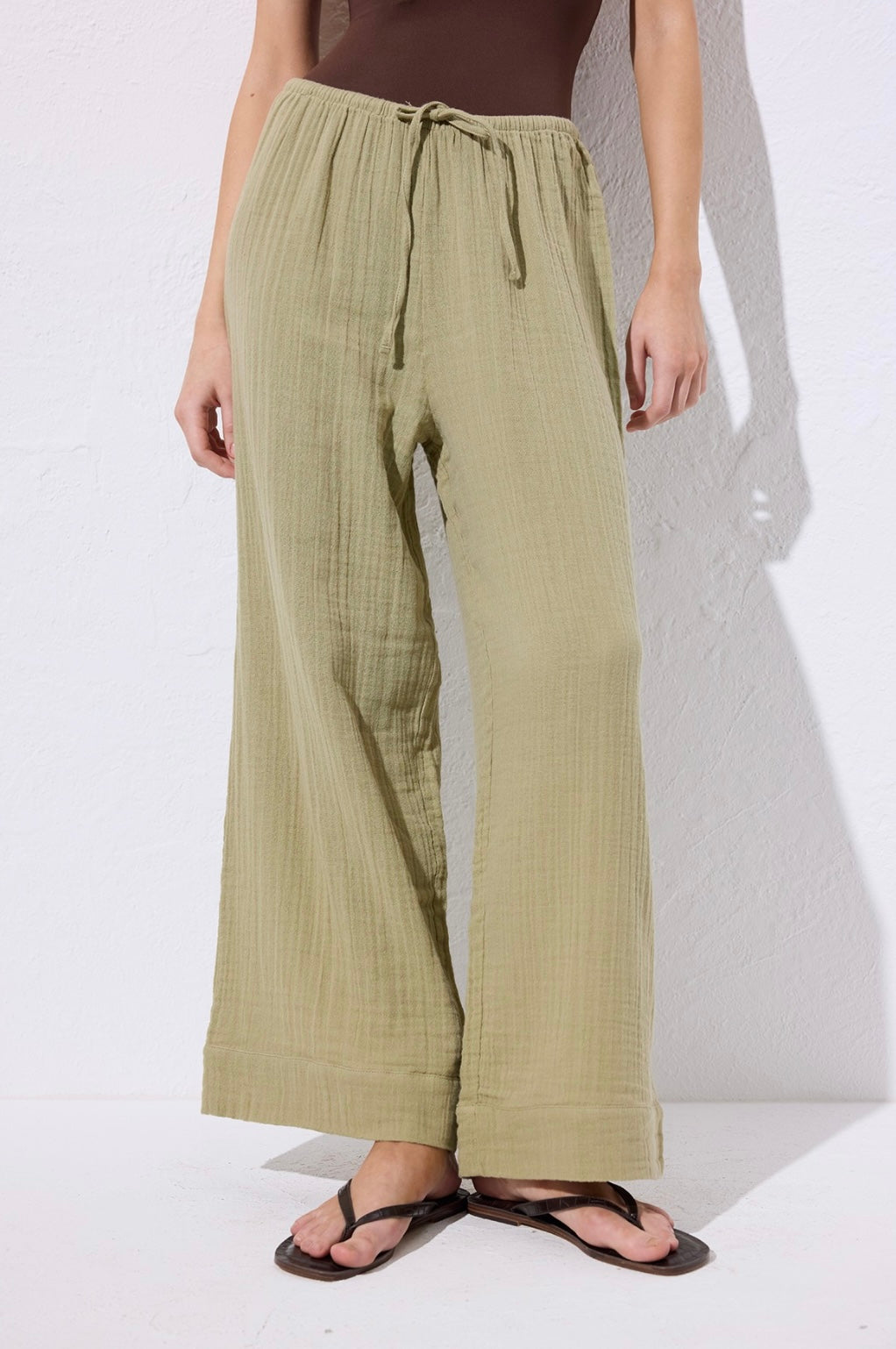 Normale Passform, hohe Taille, knöchellang, elastischer Bund mit Bindegürtel. Aus gewebtem Stoff gefertigt.