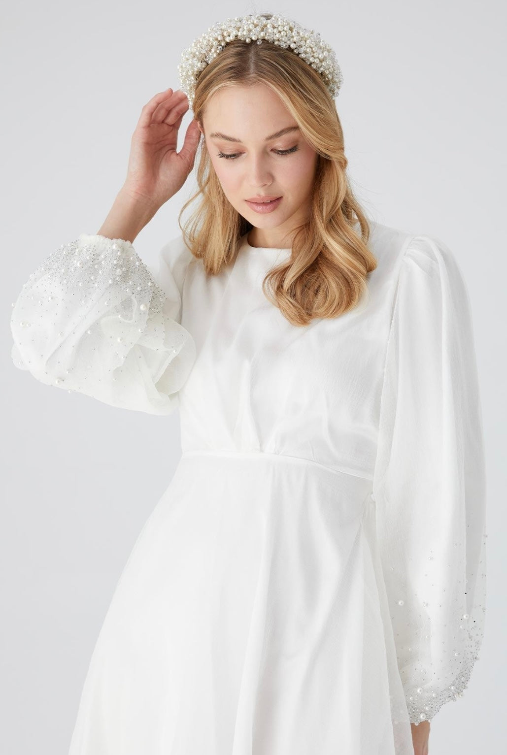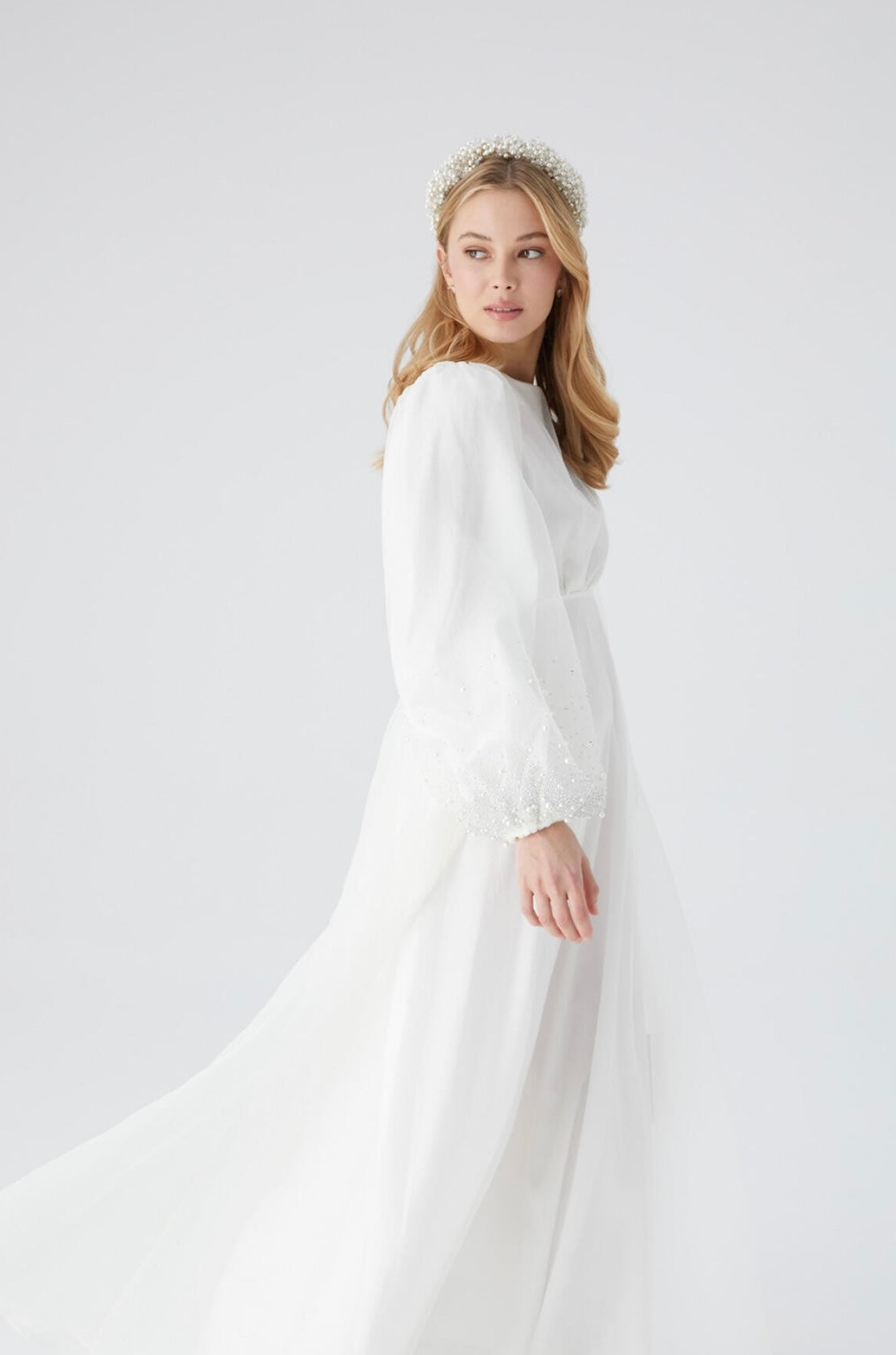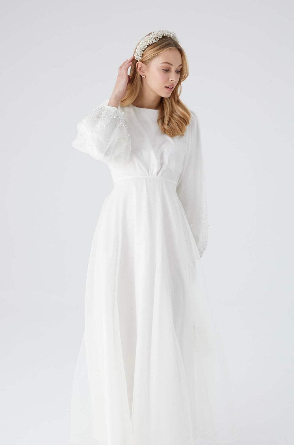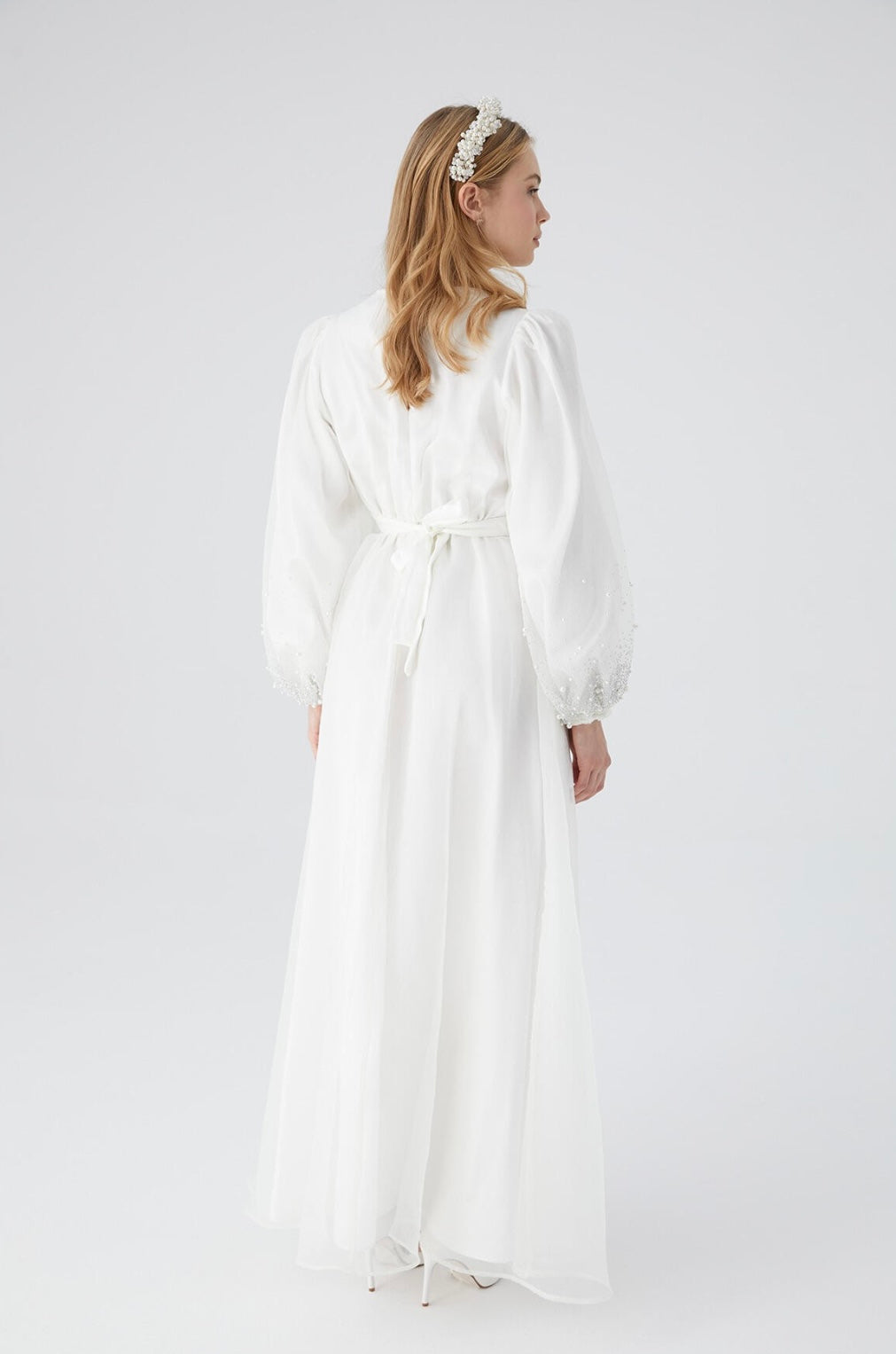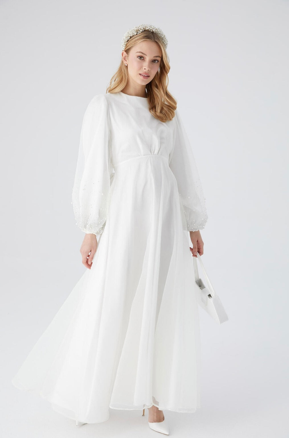 Dieses festliche Kleid aus leichtem Organza überzeugt mit einem femininen Schnitt: runder Halsausschnitt, voluminöse Ballonärmel, zarte Raffungen auf Taillenhöhe und ein ausgestellter Rock. Die Ärmel sind mit feinen Stein- und Perlendetails geschmückt - ein stiller Blickfang für Standesamt, Nikah oder besondere Tage.