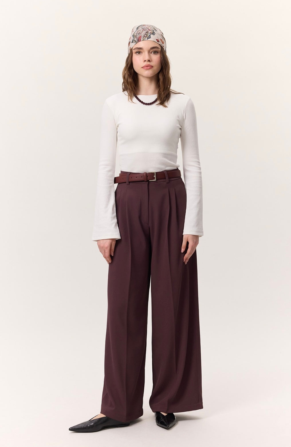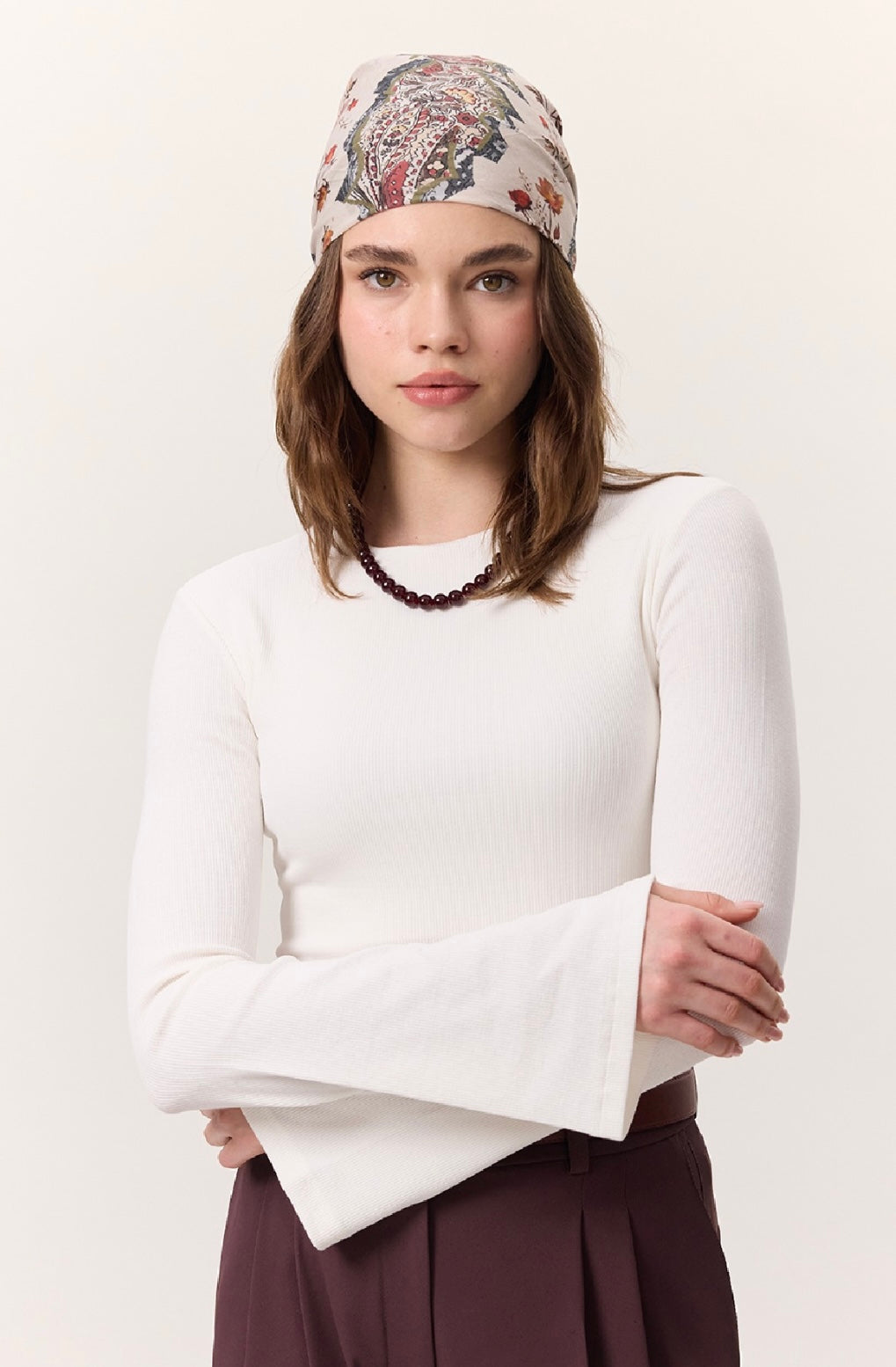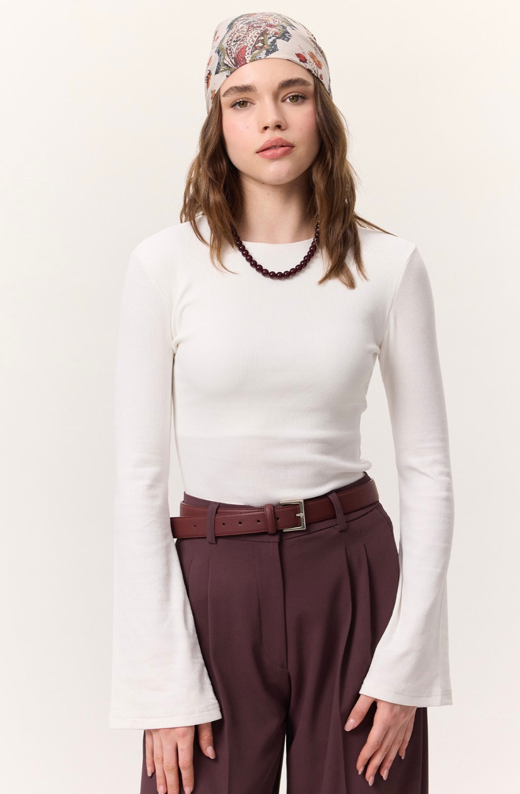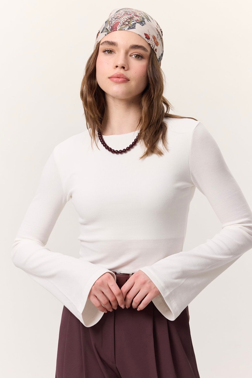 Rundhalsausschnitt, langärmelig, leicht ausgestellter Ärmelabschluss im Trompetenstil, figurbetonte Passform.