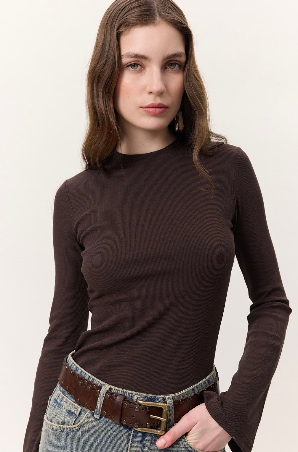 Rundhalsausschnitt, langärmelig, leicht ausgestellter Ärmelabschluss im Trompetenstil, figurbetonte Passform.