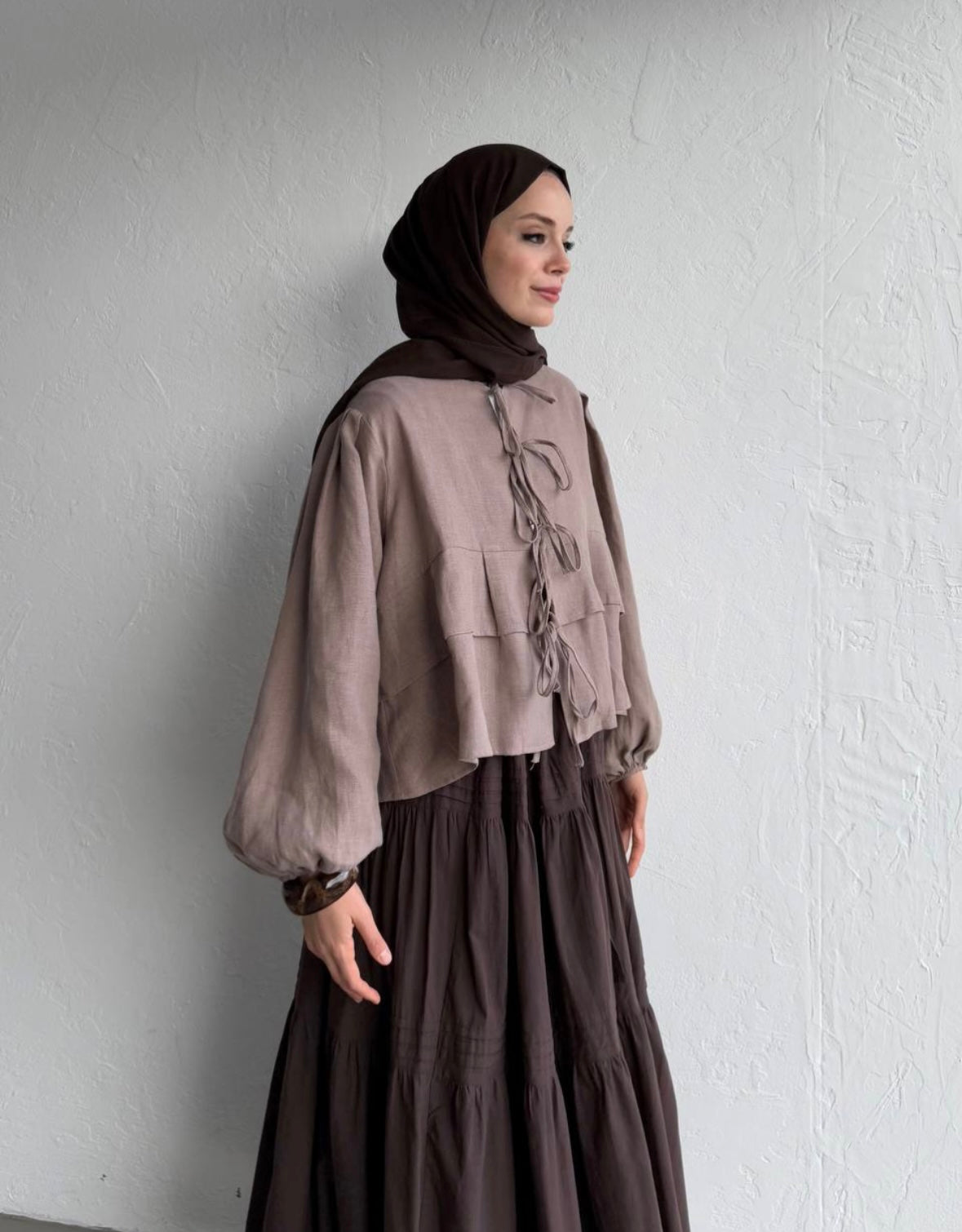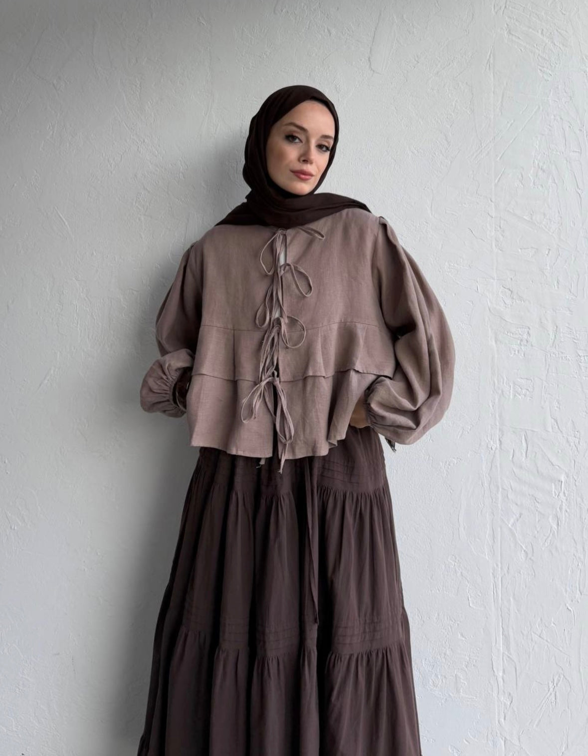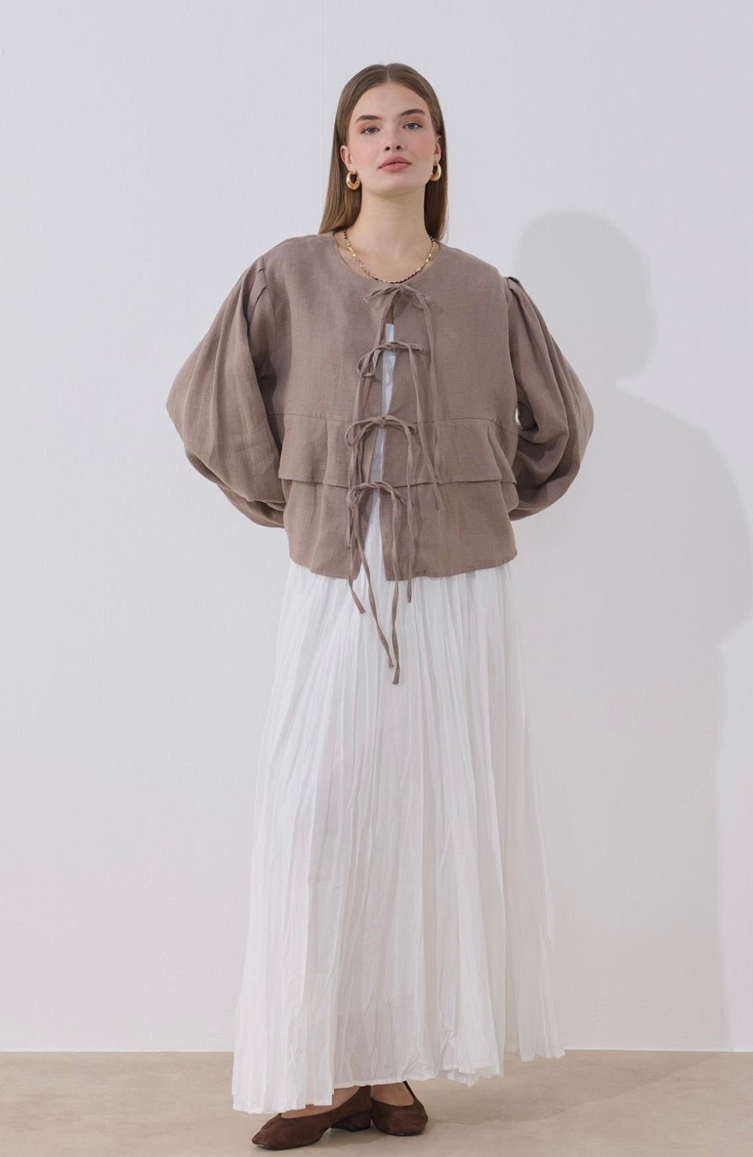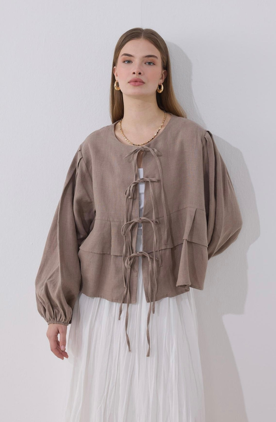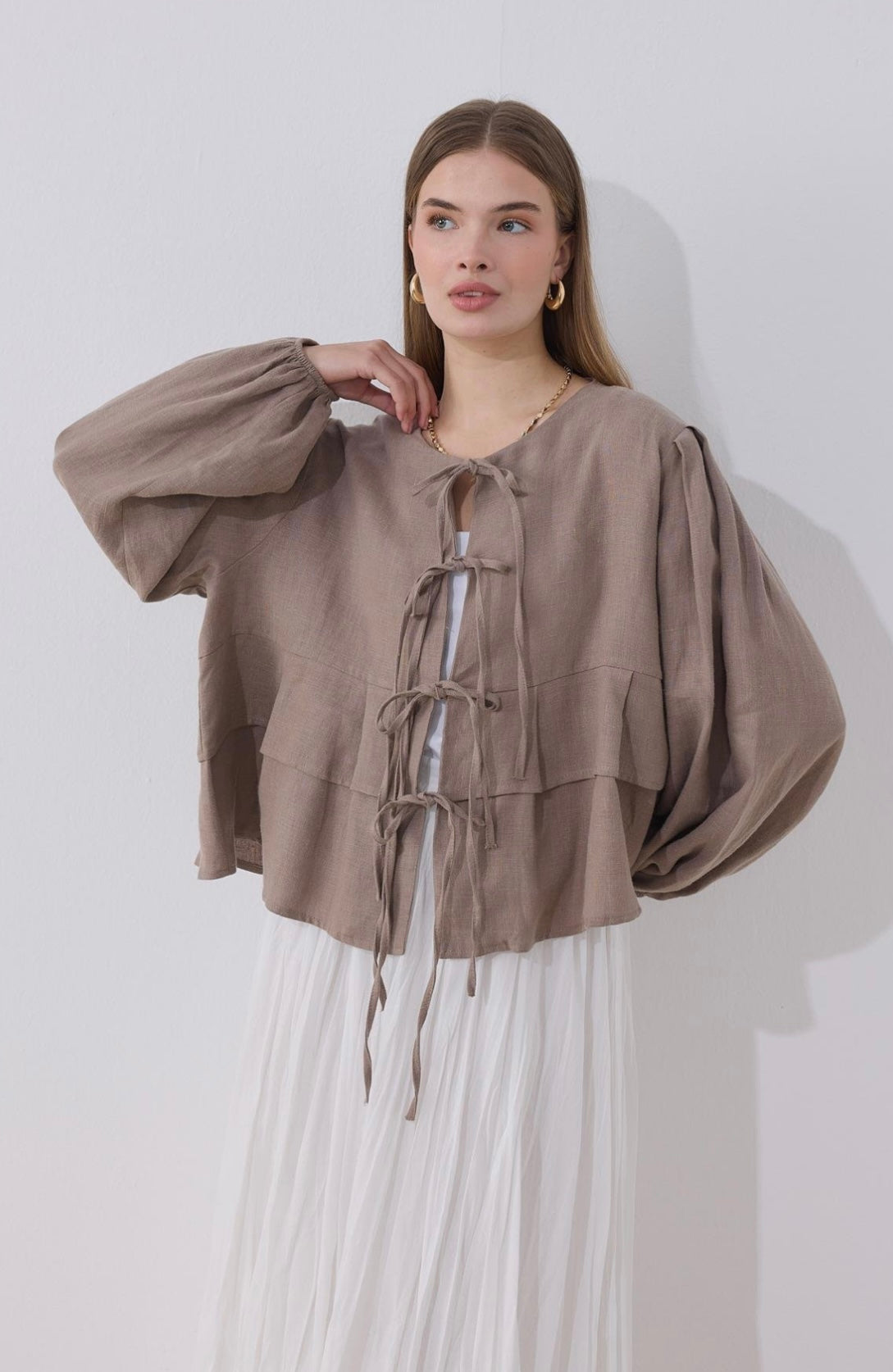 Lässige Leinenbluse mit Bindebändern. Der lockere Schnitt mit überschnittenen Schultern und voluminösen Ballonärmeln sorgt für eine stilvolle Silhouette. Eine abgestufte Naht auf Taillenhöhe verleiht dem Look Struktur und eine feminine Note.